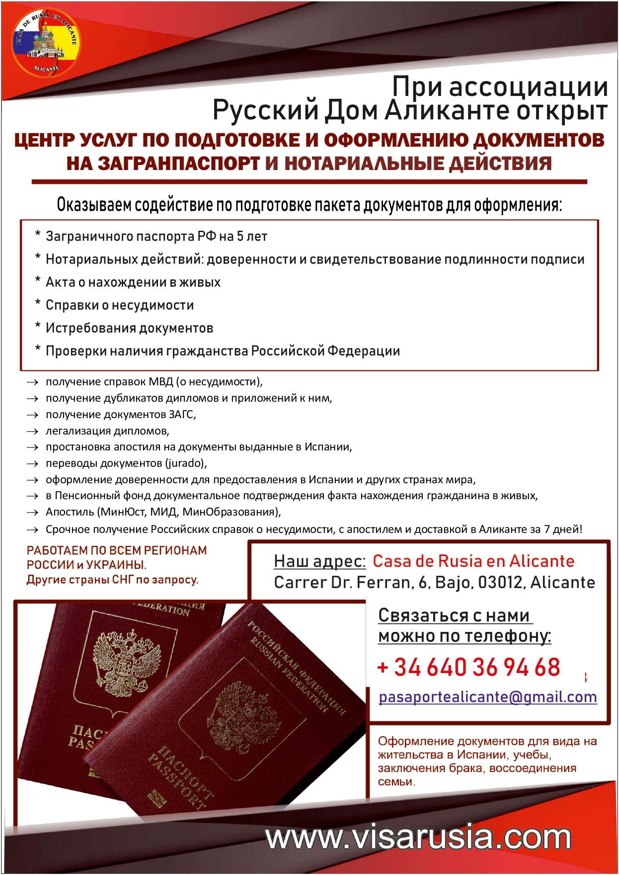 При Русском Доме Аликанте открыт Центр услуг, в котором граждане Российской Федерации могут оформить и получить новый ЗАГРАНПАСПОРТ НА 5 и 10 ЛЕТ,