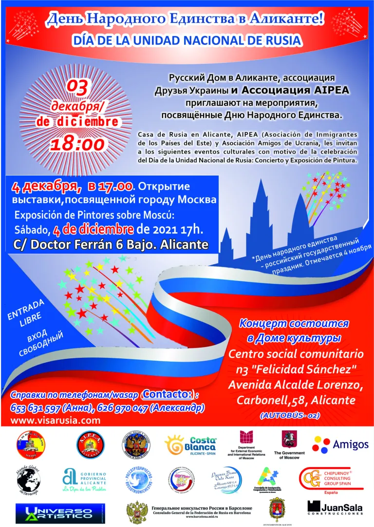 Вот и отшумел очередной Фестиваль Славянской культуры в Аликанте! В минувшую пятницу 3 декабря на сцене социокультурного центра Felicidad Sanchez прошел национальный праздник- День Народного Единства. И хотя праздник этот еще молодой, но он уже прочно вошел в календарь государственных праздников и отмечается с размахом. Мы находимся вдали от нашей Родины, но душой и сердцем мы вместе с нею и с народом нашей необъятной страны. И поэтому стало уже доброй традицией отмечать этот праздник здесь, в Аликанте.
