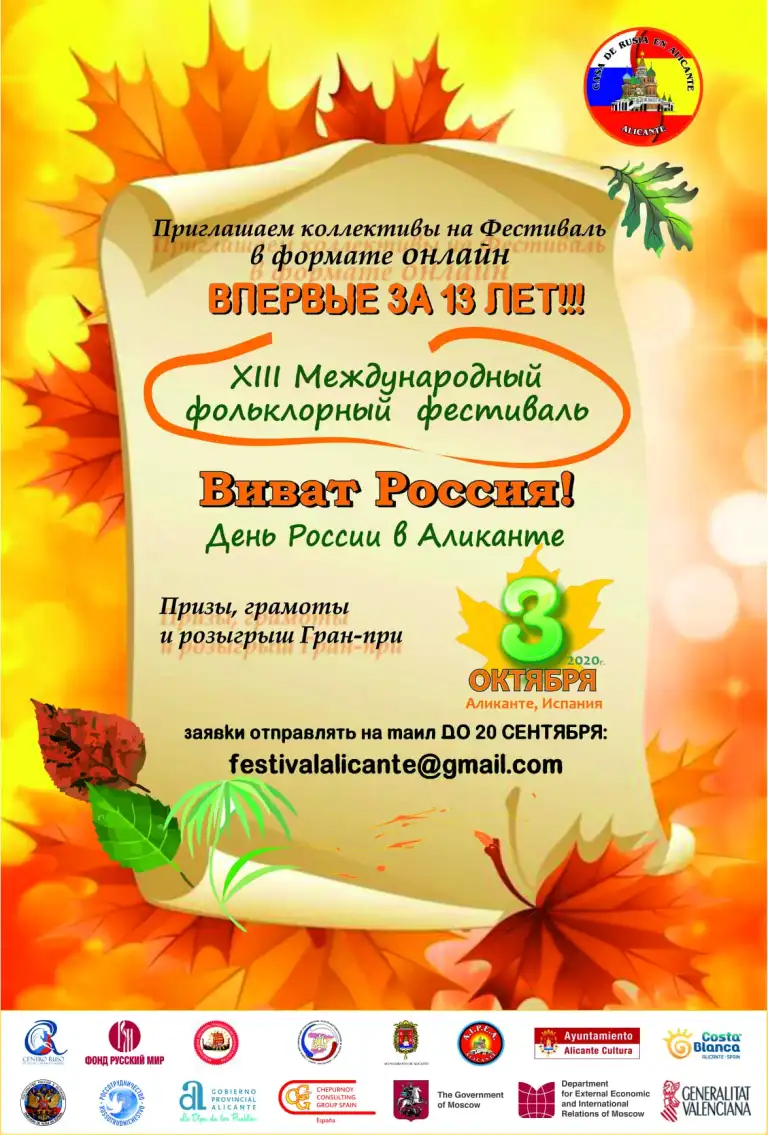 Русский Дом в Аликанте и Ассоциация иммигрантов стран Восточной Европы в Испании (АИПЕА), приглашает творческие коллективы, сольных исполнителей, спонсоров и волонтеров, для участия в . По известным мотивам, связанным с эпидемией, впервые, наше мероприятие будет проведено в формате ONLINE и на конкурсной основе.