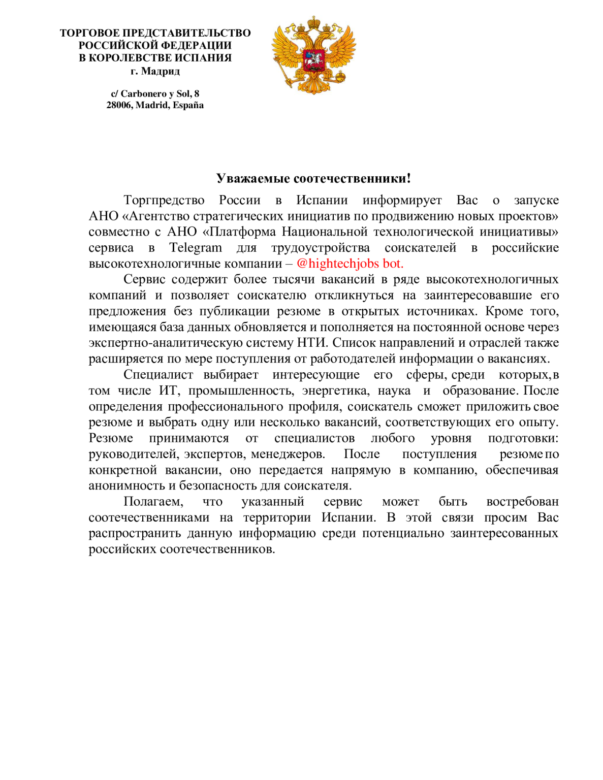 Уважаемые соотечественники! Publicada en mayo 3, 2022 Торгпредство России в Испании информирует Вас о запуске